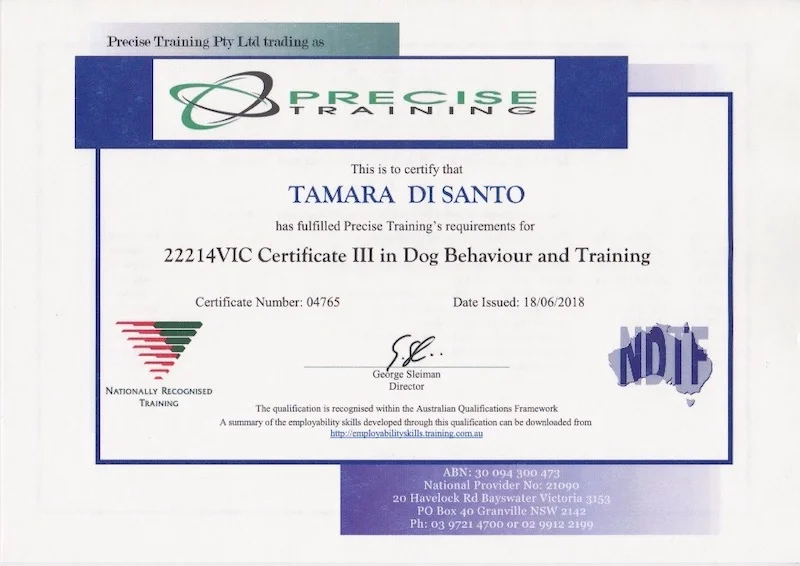 - Nationally Accredited Dog Behavioural Training Consultant (NDTF)