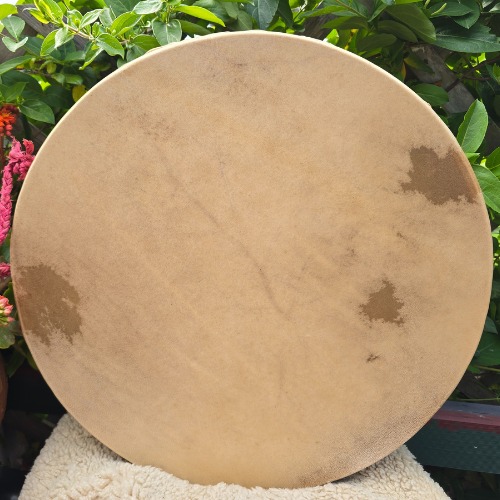 Both faces are stretched with natural goat hide, producing a low, soothing rumble reminiscent of distant surf and rolling thunder.